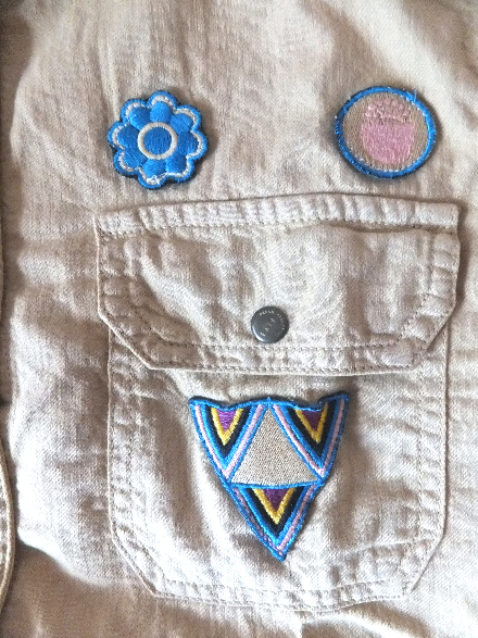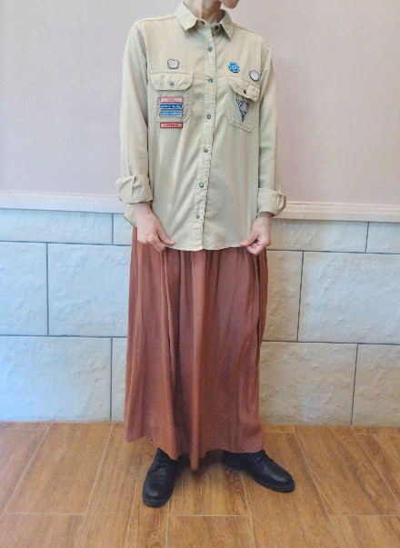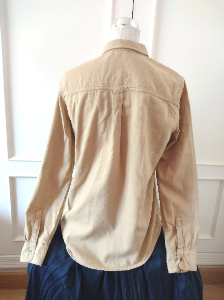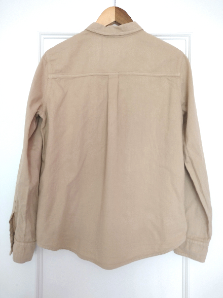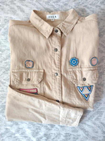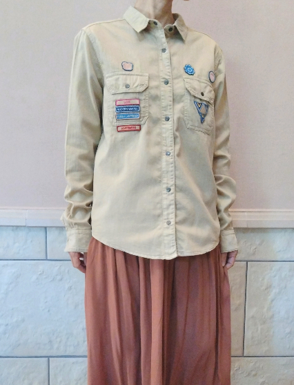 ユーズド商品・フランスFIVEの多彩なワッペン付きベージュ色ワークシャツ [シャツブラウス・フランス]